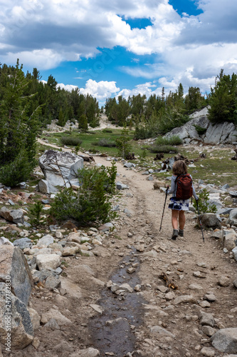 Female hiker concentrates while hiking on a dowhill slope in the Eastern Sierra Nevada mountains in the Little Lakes Valley trail