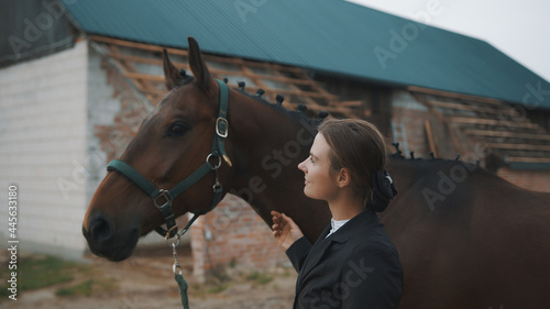 Female horse owner holding the bridle of her dark brown horse outside the stable. Smiling at her horse. Preparing for the horse riding competition. The horse mane is done in a beautiful braid.