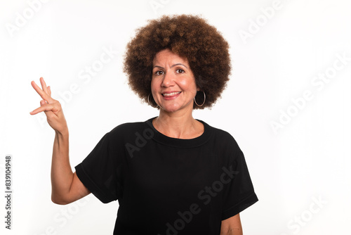 Female interpreter of the Brazilian sign language, Libras, making the letter T.