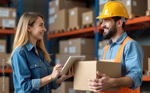 Female Inventory Manager Shows Digital Tablet Information to a Worker Holding Cardboard Box, They Talk and Do Work. In the Background Stock of Parcels with Products Ready for Shipment. High quality