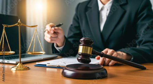 Female Judge in Robe Striking Gavel to Announce Verdict in Courtroom – Close Up