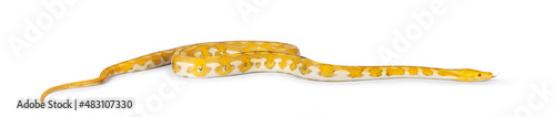 Female juvenile Reticulated python aka Malayopython reticulatus snake, full length isolated on a white background. Tongue out.