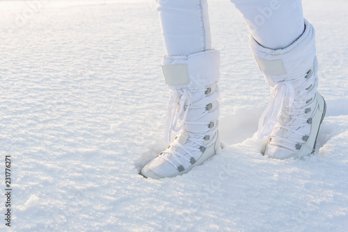 Female legs with white snow boots on, walking by the snow cover in sunlight. Winter background.