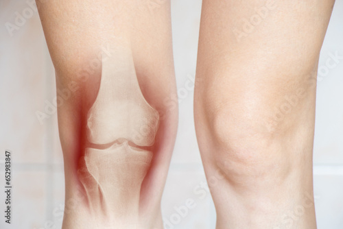 Female legs with x-ray of the patella with overlay effect, knee pain, knee pain, pain