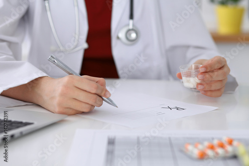Female medicine doctor fills up prescription form to patient closeup. Panacea and life save, prescribe treatment, legal drug store, contraception concept