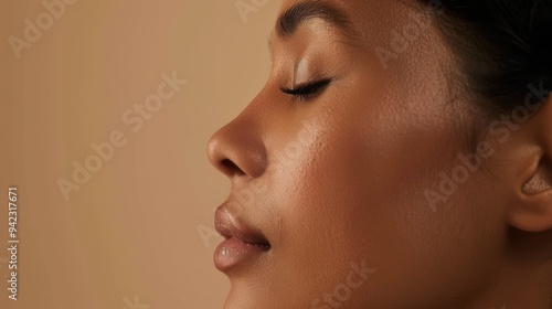 Female model showcasing skincare routine and facial profile in a studio setting, emphasizing cosmetics, natural glow, and self-care in a neutral background