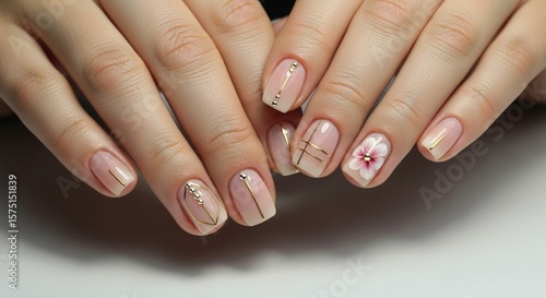 Female nails with elegant nail art on neutral background. Glossy polish, refined details, premium image for manicure advertising.