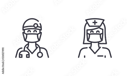 Female Nurse and Male Doctor Wear Medical Face mask to Protect Themself from Coronavirus or Covid-19. Outline Illustration Vector. EPS 10. Editable Stroke.