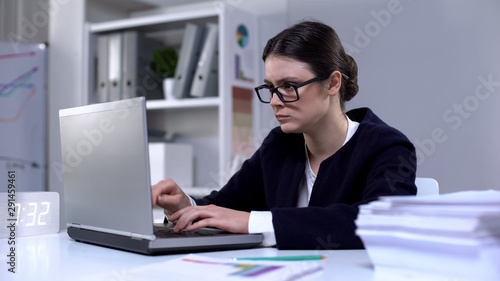 Female office worker typing on computer, looking responsible and focused on task