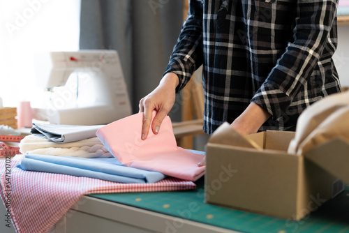 female online store small business owner seller entrepreneur packing package post shipping box. Woman tailor or dressmaker preparing delivery parcel on table. Ecommerce dropshipping