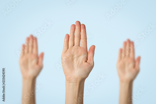 Female palms raised up on a blue background. Stop gesture. Concept stop someone, warn