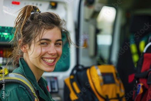 Female Paramedic Responding to Emergency with Happy Smile and Oxygen Unit