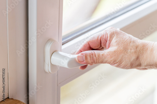 female person opening white pvc window door. window problem fix concept. repair doors lock conceptual