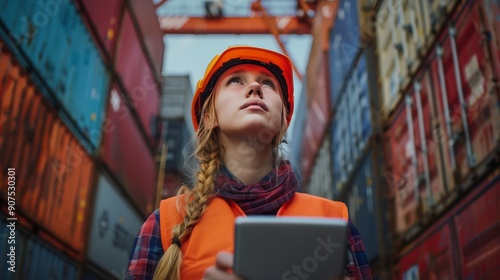 Female porteye working with tablet in front of cargo containers, wearing safety vest and helmet looking up to sky