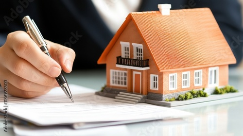 Female real estate broker explaining model home details, signing contracts, and discussing mortgage or insurance offers