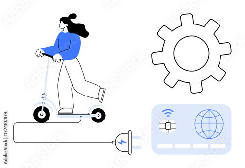 Female riding electric scooter connected to plug. Gear and digital panel elements highlight eco transport, connectivity, energy efficiency. Ideal for mobility, innovation, sustainability, clean