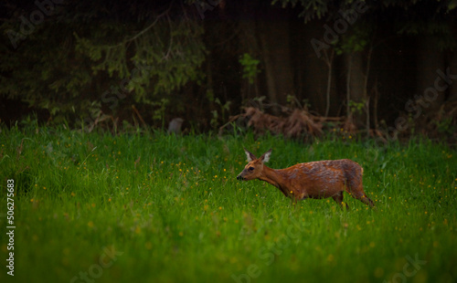 Female roe deer on green spring meadow near forest