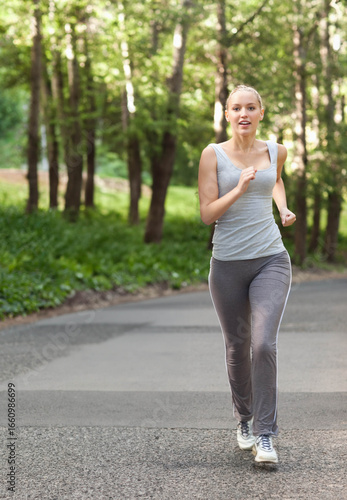 Female runner jogging on paved forest road in grey tank top and leggings surrounded by trees