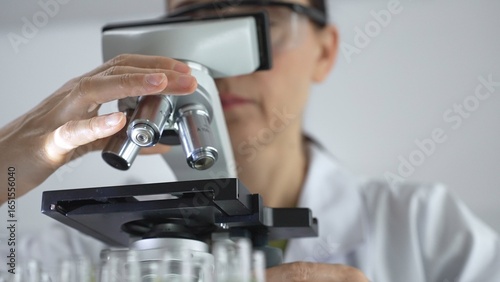 Female scientist analyzing test samples under microscope in contemporary research environment of laboratory. Medicine, healthcare and science concept