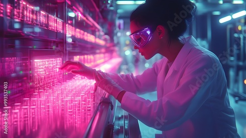 Female scientist in a pharmaceutical factory, surrounded by holographic medical data while inspecting vials on a conveyor belt, vibrant neon colors, Cyberpunk, High-tech
