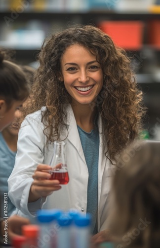 Female scientist teaching students in lab coat, holding red liquid and blue chemical