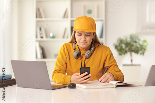 Female student with a laptop computer and a mobile phone sitting at home and writing
