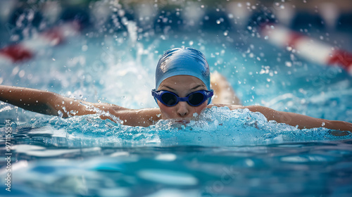 Female Swimmer in Action Inside Swimming Pool: Performing a stroke.
