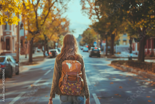 Female teacher walking home through a tree-lined street in autumn, preparing for school work in the late afternoon