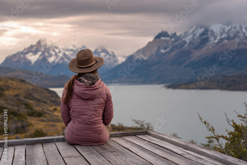 Female tourist contemplating the majestic mountains and lake in Torres del Paine National Park, Chile