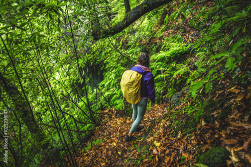 Female tourist wearing a rain jacket and carrying a raincoat backpack walks along a forest trail covered with fallen leaves. Poco dos Pulgas waterfalls, Madeira, Portugal, Europe.