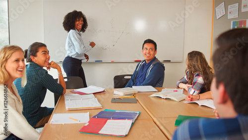 Female Tutor At Whiteboard Teaching Class Of High School College Or University Students Around Table