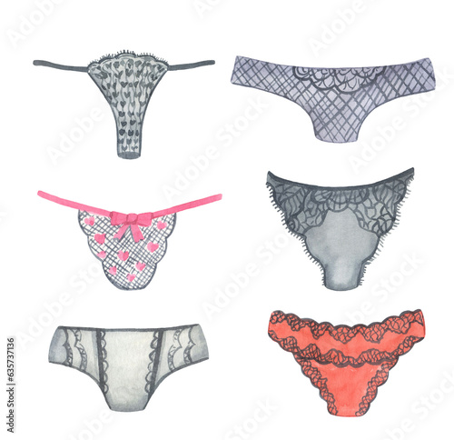 Female underpants isolated on white background. Woman pants different types. Watercolor set.