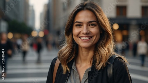 female urban planner on busy urban street background