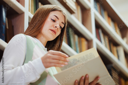 Female with long hair wearing shirt and vest leaning on bookcase and reading interesting book, turning pages, moving her lips while reading. Low angle reader enjoying literature in library
