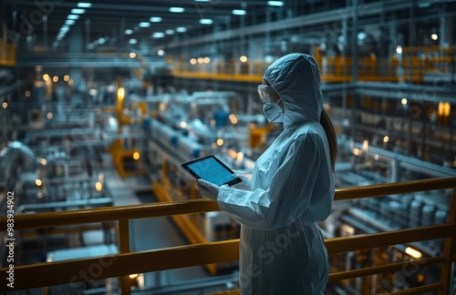 Female worker in protective gear holding a tablet on a factory balcony with CNC machines