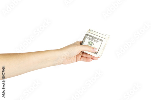 Female's hand holds stack of dollars on white background.