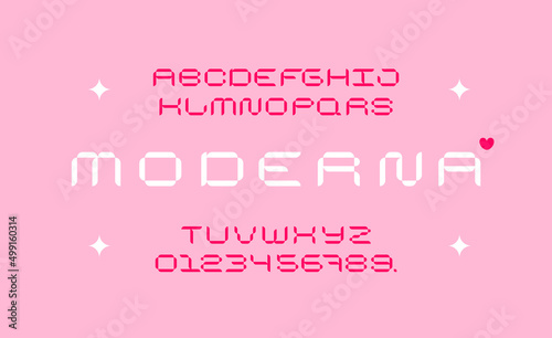 Feminime cyber font. Trendy pixel modern latin alphabet. Uppercase, letters and numbers. Stylish type for contemporary logo, print, header.