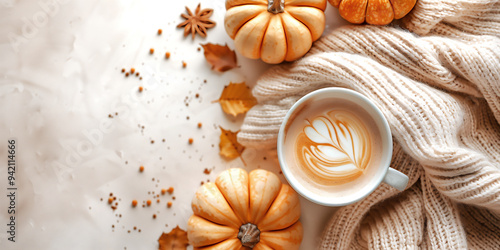 Feminine flat lay with cup of coffee, cozy ivory colored sweater and autumnal decor on a pastel background. Great design with copy space.