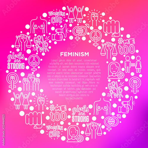 Feminism concept in circle with thin line icons: women's rights, girl power, gender equality, sex dicrimination, me too, protest, girls are strong. Modern vector illustration, print media template.