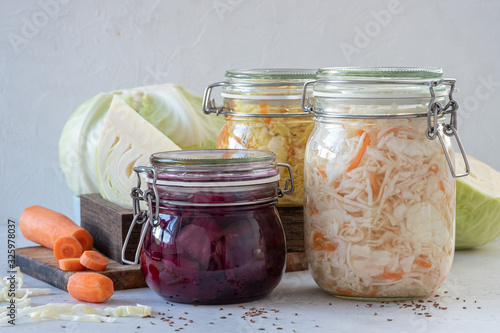 Fermented preserved vegetarian food concept. Cabbage sauerkraut sour glass jars
