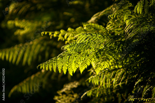 Fern leaves on forest illuminated by sun