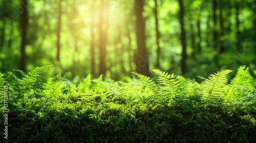 Ferns and moss blanket the ground, sunlight filters through a green, lush forest