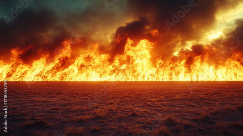 Ferocious fire wall in a dramatic landscape under a cloudy sky