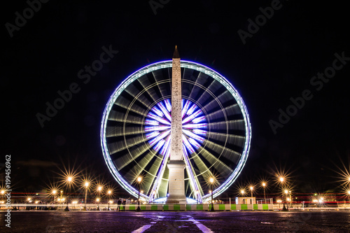 ferris wheel and obelisk in Paris, France by night