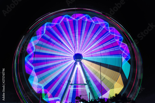 Ferris wheel and rollercoaster in motion at amusement park at night.