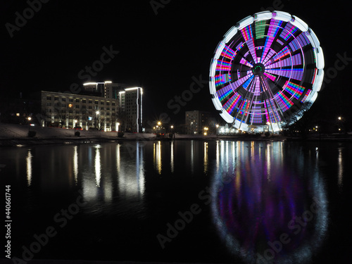 Ferris wheel at long exposure at night. Live composite of the attraction in the park in winter. Reflections of light and color in the lake water.