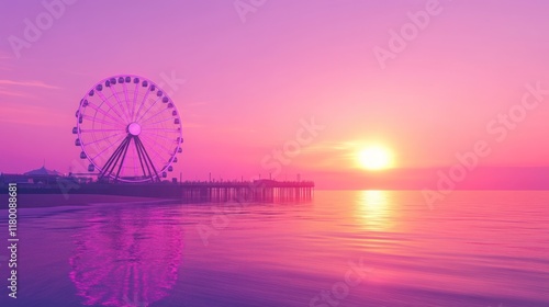 Ferris wheel by pier on beach at sunset; pink ocean view. Ideal for travel website or ad
