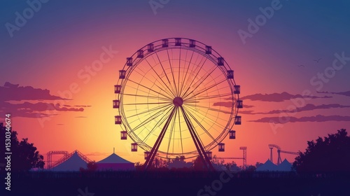 Ferris wheel silhouette at sunset over amusement park.