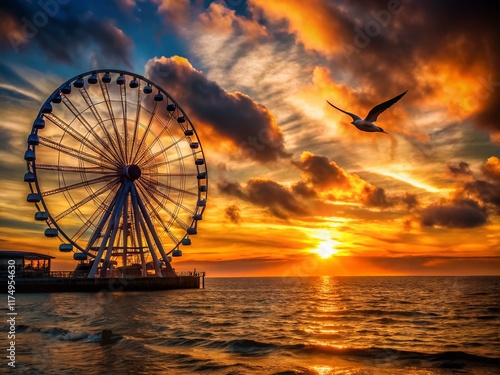 Ferris Wheel Silhouette at Sunset with Seagull, Cloudy Sky, Coastal Scene