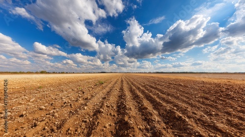 Fertile agricultural land under a dynamic sky near the horizon showcasing rows of freshly plowed soil
